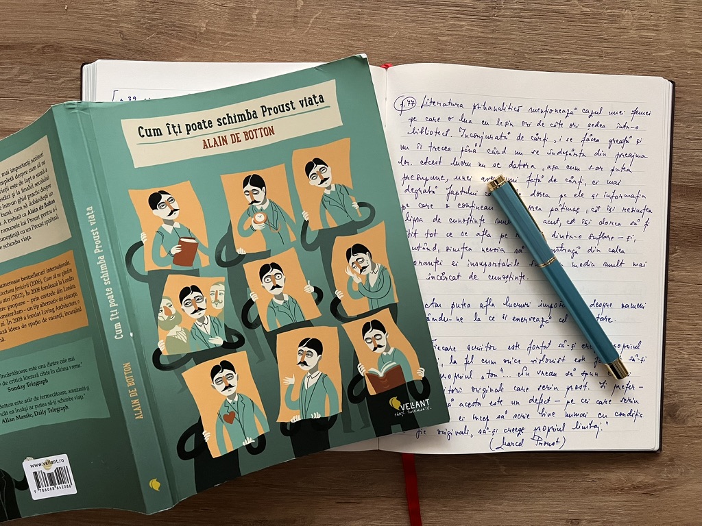 • Cum îți poate schimba Proust viața, de Alain de Botton (Ed. Vellant; trad. rom. Mihaela Ghiță): O carte simpatică și lejeră, care regândește opera lui Proust din persopectiva (biblio)terapiei și chiar te face să te familiarizezi ușor cu ea și cu autorul său. Plină de anecdote literare și detalii din În căutarea timpului pierdut, poate fi un bun declanșator pentru a te face să citești acest magnus opus al secolului XX.
